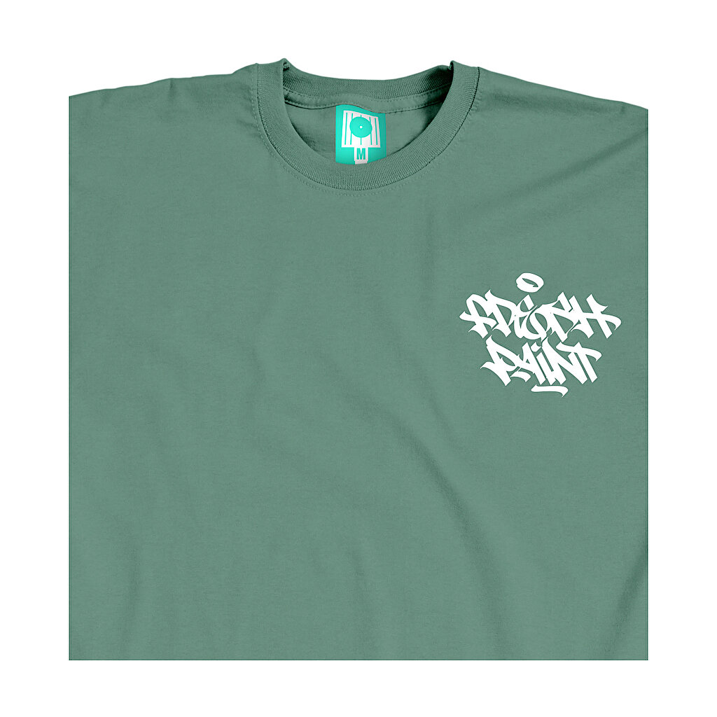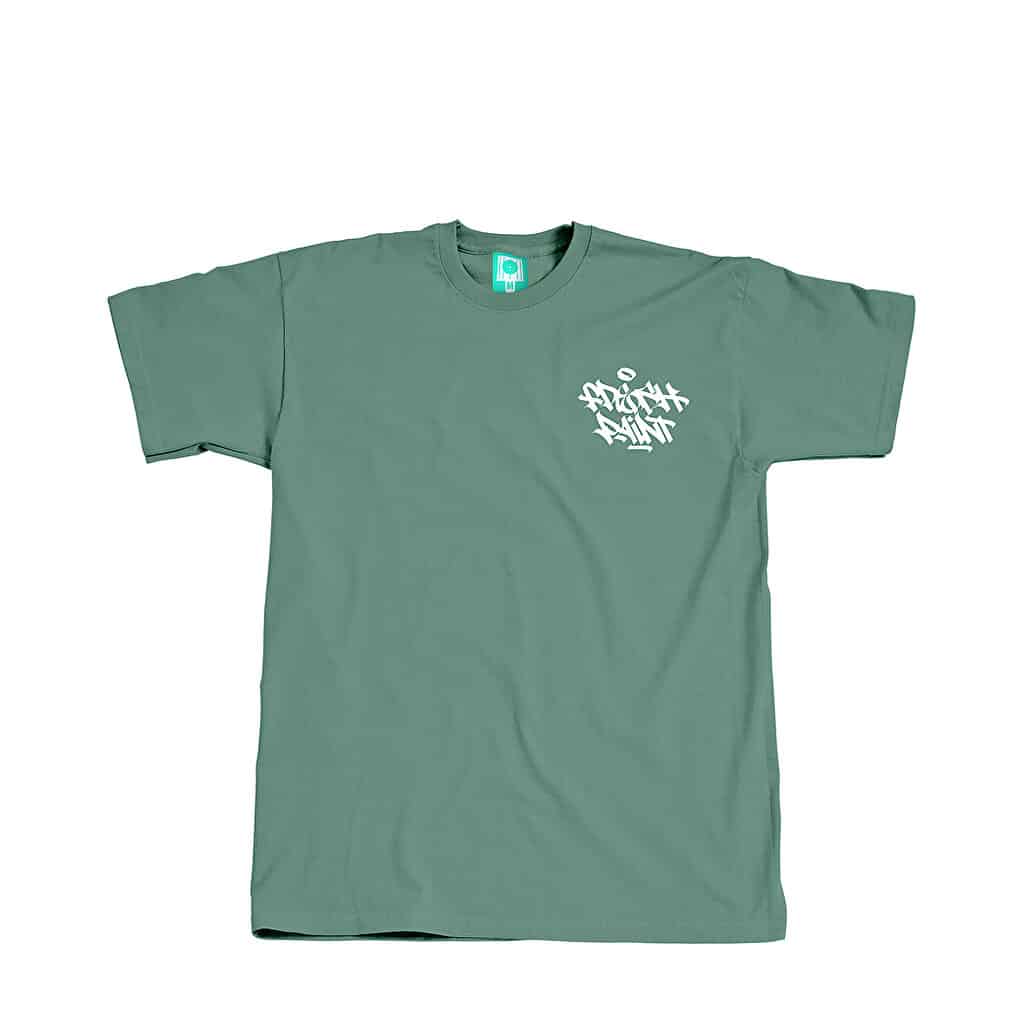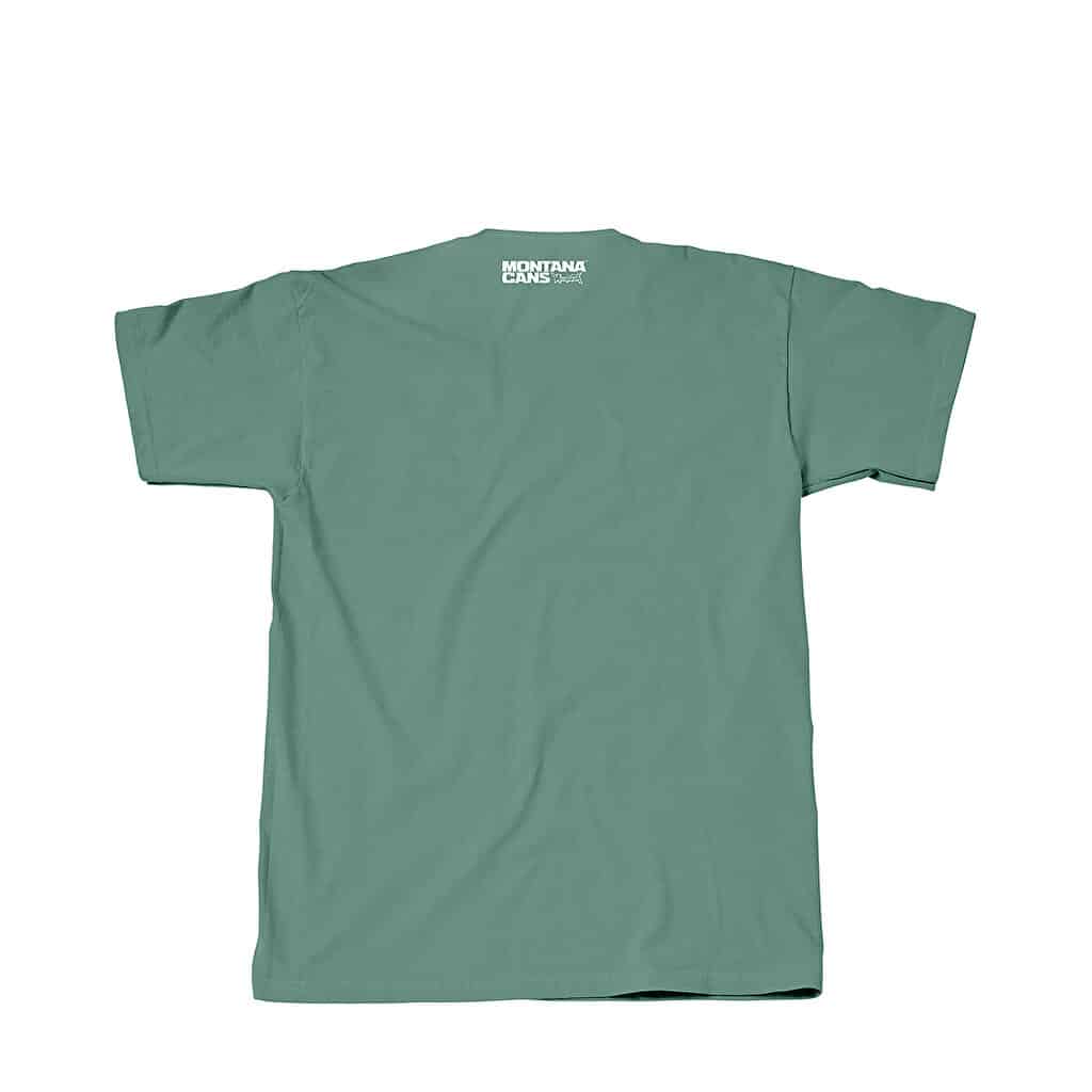 T-shirt Montana Cans Tag z nadrukiem marki Itchie z Wiesbaden/Kolonia. T-shirt ma mały biały tag na lewej piersi na zielonym tle