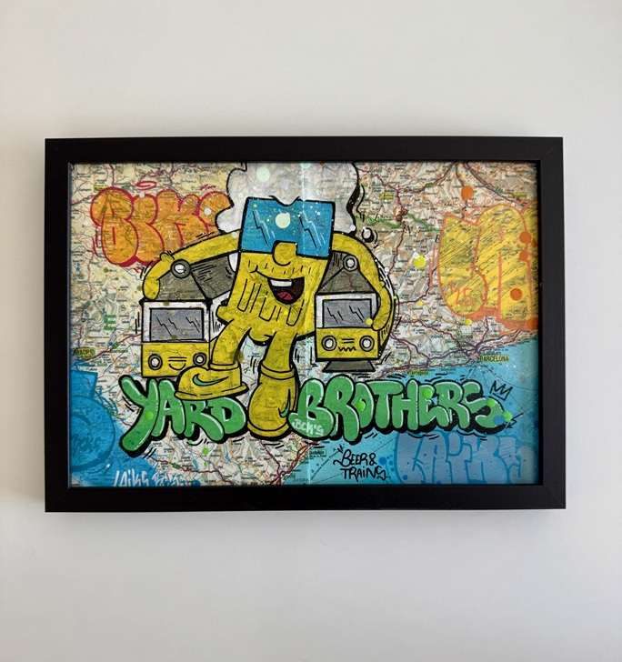 Opis: Obraz Graffiti wykonany na starej mapie techniką mieszaną, spray i markery, inspirowany starymi komiksami i bombingiem. Zawiera klasyczne dla artysty postacie Piwka oraz Trowupy.